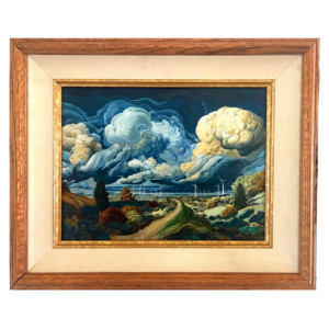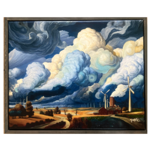 Poe works in layered glazed oil painting, a method associated with Old Master traditions. His process builds depth over time, creating skies that feel: